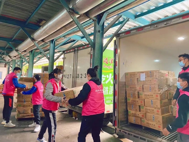仪式现场,鸿津食品员工联同志愿者们有条不紊地将物资一一搬运装车。随后,一辆辆装满物资的货柜车发出,满载顺德人民深厚情谊,将于42小时后运抵上海,帮助上海人民渡过难关,让疫情阴霾早日散去。