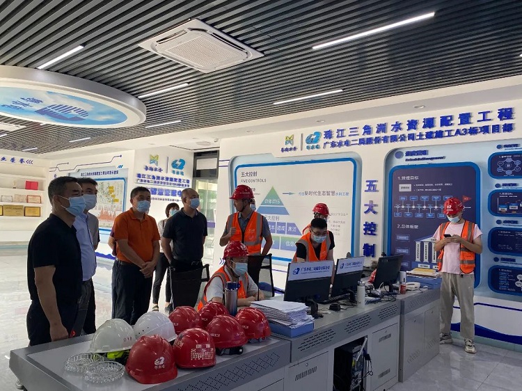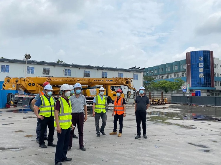 随后,调研组到西水东送珠三角水资源A3标项目部察看工地内工作井的深基坑土方开挖作业情况,并听取了工程情况汇报。目前A3标项目已完成工作井施工,正在进行盾构隧道掘进施工。待完工后,只保留直径约35米的井面作维修检测用,并建设相关的建构筑物,其余的用地交还给属地街道。其中,计划4#工作井结合树林公园进行工作井外观设计,与周边环境进行融合。5#工作井作为渗漏排水井。