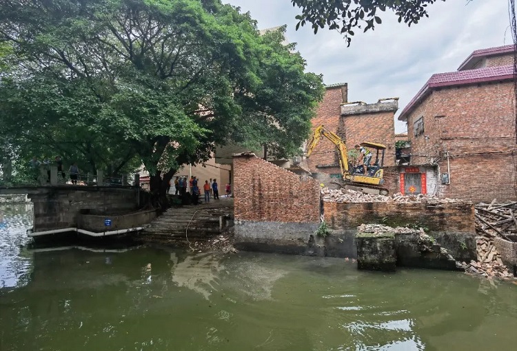 当天上午,伴随着“轰隆隆”的声响,大型钩机有序进场,铁臂一挥,位于新龙涌的12处临河违章建筑物陆续应声倒下,拆除建筑面积约600平方米。