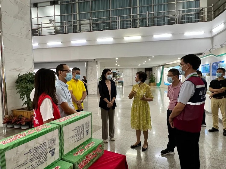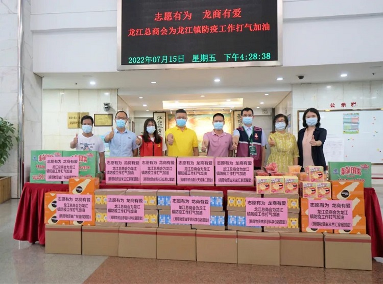 7月15日下午,龙江总商会人大代表联络站与驻站代表组织发动南兴天虹果仁厂、米兰汇家居、广东雄辉市政、罗恩科学仪器等企业,捐赠了清凉饮料、坚果、水果等一批爱心物资至流调中心,区人大常委会教科文卫侨工委主任叶少红、区卫健局党组书记钟德慰,龙江镇人大副主席梁晓韵、区流调中心相关负责人接收了爱心物资。