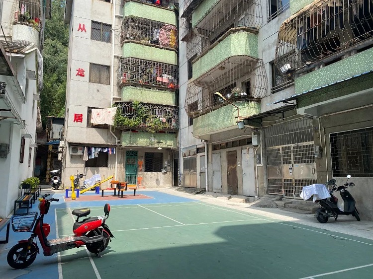 调研组一行还实地走访了于去年完成改造的从龙居小区。改造后的从龙居不仅外观焕然一新,还进行了楼内装修加固、重新铺设污水管网、加装消防系统、加装可视对讲门禁等一系列改造,小区内部居住环境有了很大提升。改造中还将小区原有的公共空间进行了提升美化,增设了羽毛球场和健身器材等,为居民提供了休闲运动空间。
