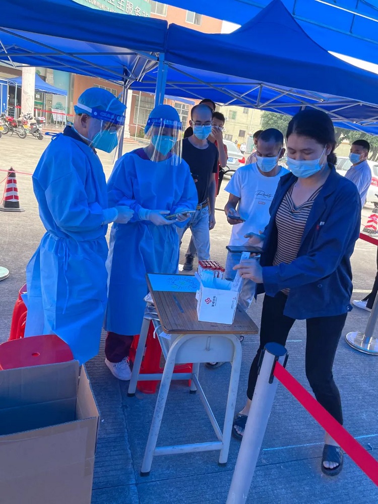 在永丰联络站,区人大代表刘江渡听说村委会正开展核酸检测工作,缺乏工作人员的情况后,马上穿上防护服,投入核酸检测志愿服务工作。