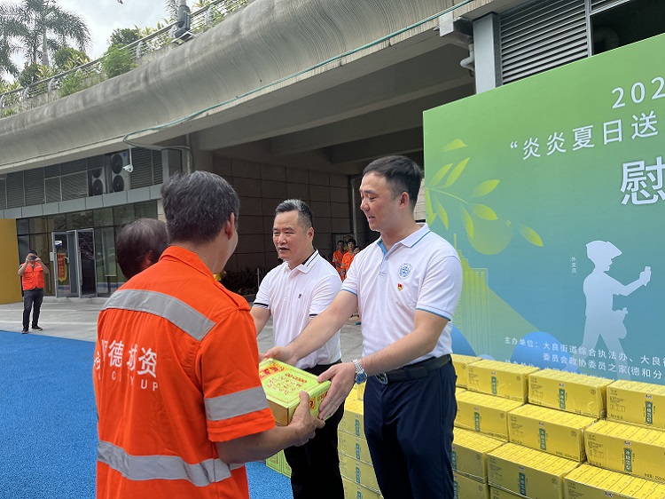 随着夏季高温季节的来临,气候日益炎热,大良街道辖区环卫工人、综合巡查人员、外卖员等一线劳动岗位工作人员依旧坚持在户外做着“苦、脏、累”的工作。