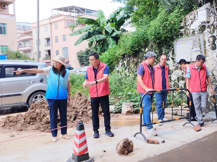 区人大代表梁凯红与容边社区直联团队、党员干部一起巡查容边社区涵洞的水浸黑点,了解水浸的成因以及解决方案。前期,梁凯红也收集了居民群众反映的部分水浸黑点,并通过实地走访与社区党委一起研讨解决方案,进一步巩固人居环境整治成效,推进城市品质提升。