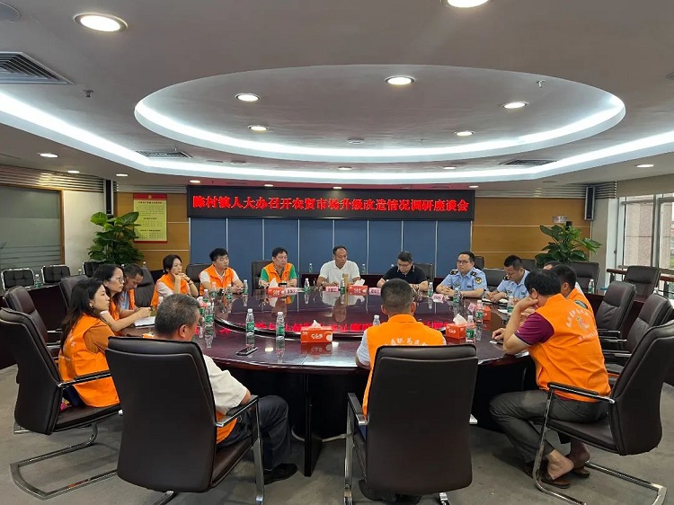 6月20日,陈村镇人大组织部分人大代表到镇内的农贸市场对其升级改造情况进行调研,并开展座谈会,谈论市场升级改造的情况。