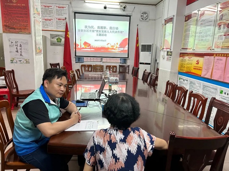 区人大代表陈耀珠走进容新社区人大代表联络点,与来访群众面对面交流,随后深入党员代表、居民代表家中走访,了解社情民意,及时回应群众问题。