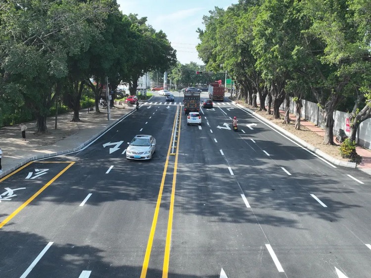 项目通过将新明大道路口两侧绿化带和人行道改造提升,腾出空间,增设了一条机动车道,由原来的“一进三出”四车道变成现在的“两进三出”五车道,整个路面由原来的15米拓宽到19米,大大优化路面通行环境。同时,路口的交通信号灯、人行横道和车辆停止线往新明方向移进10米,方便龙洲路往新明大道右转车辆转弯行驶,减少路口堵塞,畅通交通出行。