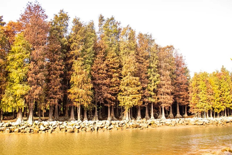 在三洲社区乌洲水闸段,成片红色的落羽杉如诗如画,为伦教染上了冬日限定色彩,吸引了各地游客前来拍照打卡。伦教城建办相关负责人介绍,乌洲水闸独特的冬日落羽杉美景每年都吸引不少市民前来拍婚纱照,为此,伦教街道在树林里的泥泞路用石板铺设了一条小道,以便市民取景拍摄。
