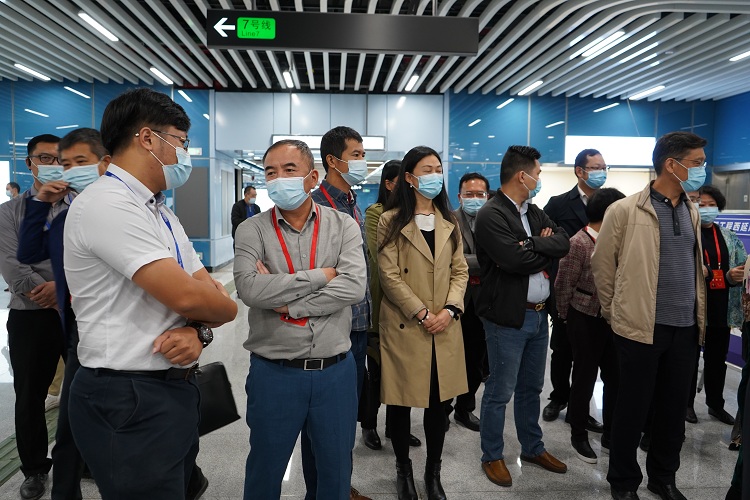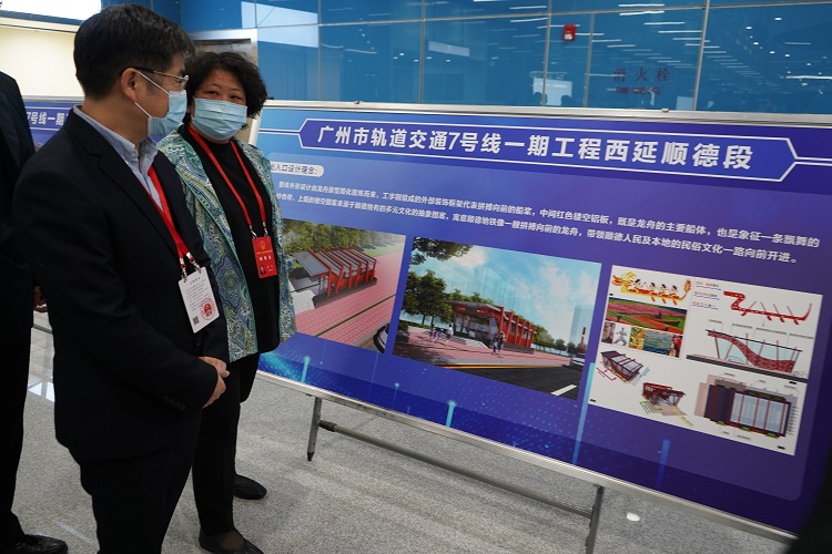 随后,视察团一行来到广州地铁7号线西延顺德段内的北滘公园站,认真听取广州地铁7号线西延顺德段项目建设进度的介绍。北滘公园站外观设计以龙舟为原型,以红色为主基调,体现了顺德龙舟文化和革命精神。北滘公园站远期与佛山地铁三号线换乘。