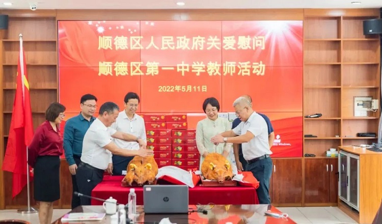 慰问组分别为顺德一中、一中外国语学校的教师们送上寓意美好的烧猪等慰问品,表达对广大师生的关怀和对学校未来发展的祝福。