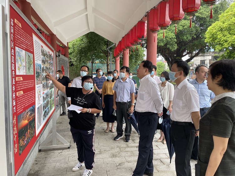 在苏岗社区鉴傍书院,调研组观看了书院文化展览,并在旧寨公园现场听取街道城建办关于苏岗片区改造提升及乡村振兴情况介绍。