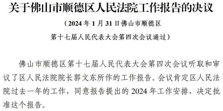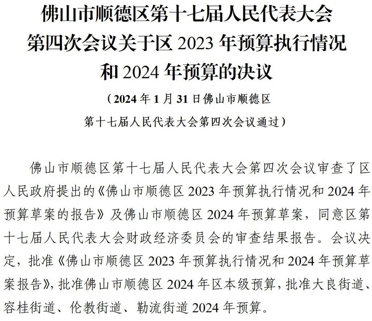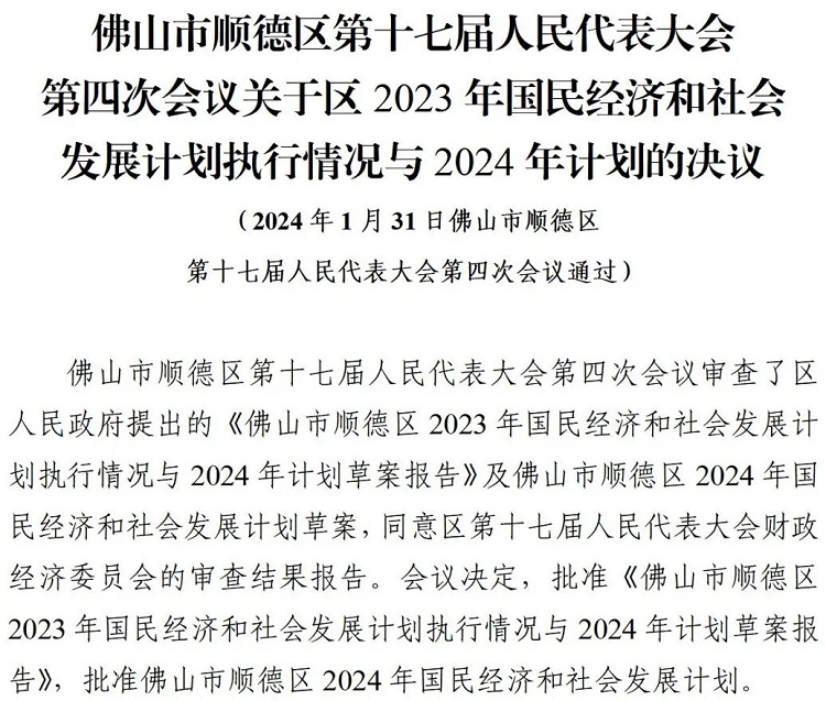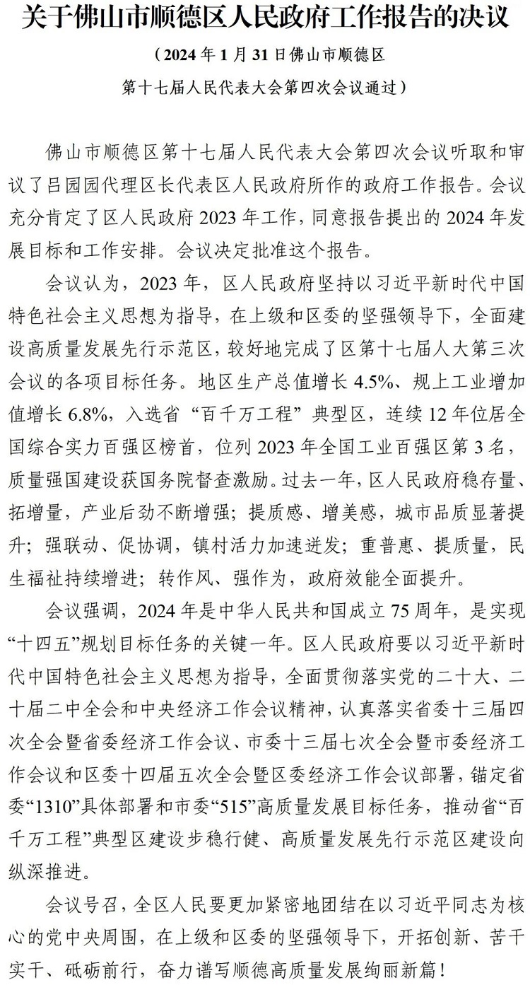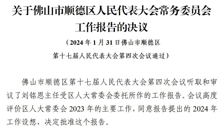 佛山市顺德区第十七届人民代表大会第四次会议通过六项决议